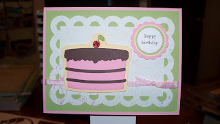 I used the Just Because Cartridge on this card for the cake and the Frame background.... The Cardstock is Pretty n Pink, Certainly Celery and DCWV older Spring paper.... I used a pink gingham ribbon and red stickles for the cherry on top! :)